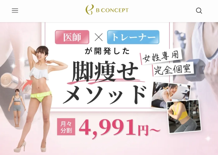多くのパーソナルジムが「全身痩せ」「筋力アップ」にフォーカスする中、ビーコンセプトは「下半身」に強みを持っており、女性が抱えがちな悩み(内もも・ヒップ・骨盤)へのアプローチが専門的です。
